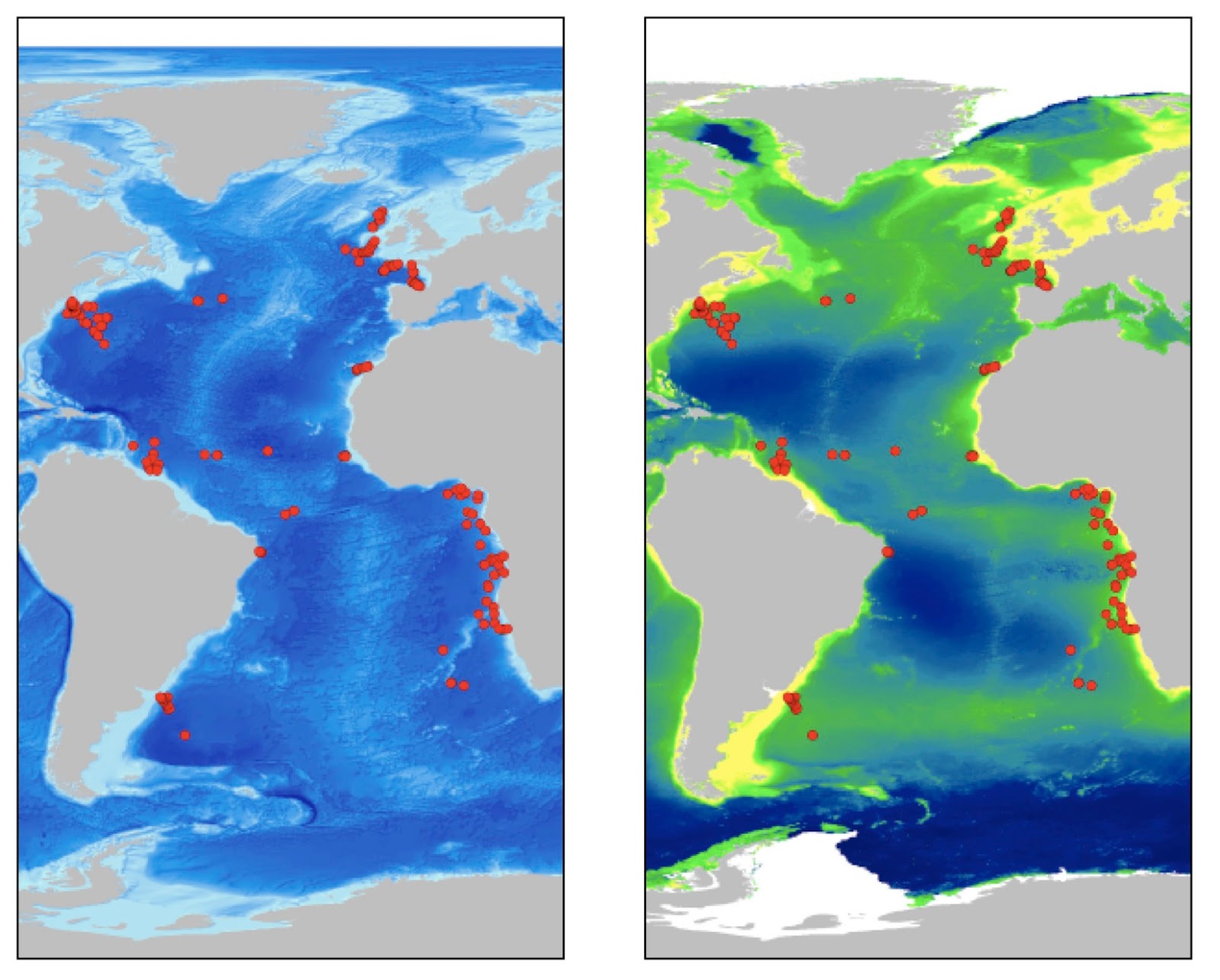 Maps showing the distribution of ocean depths (top left; lighter blues are shallower), marine snow (top right; yellows are higher), and temperature (bottom; redder is greater) in the study regions. The red points show the sampling sites from the third study, while the white are the sampling sites in the second.